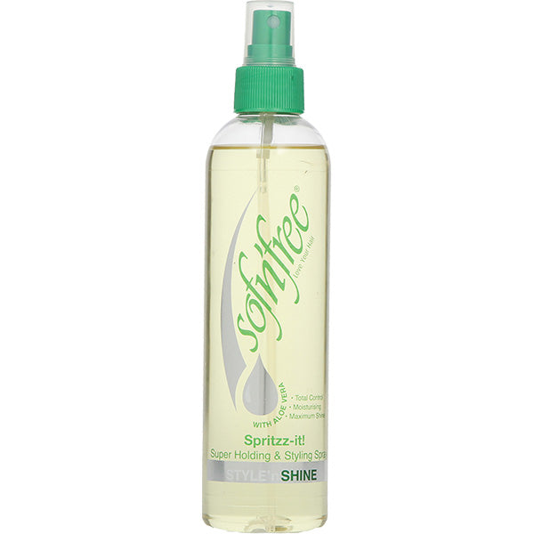 Sofn’free Spritz-it! Style n Shine Holding Spray delivers firm hold and long-lasting style while keeping hair soft, shiny, and moisturized. Infused with Aloe Vera, it helps maintain total control without flaking or stiffness. Perfect for setting styles, taming flyaways, and adding brilliant shine to all hair types.